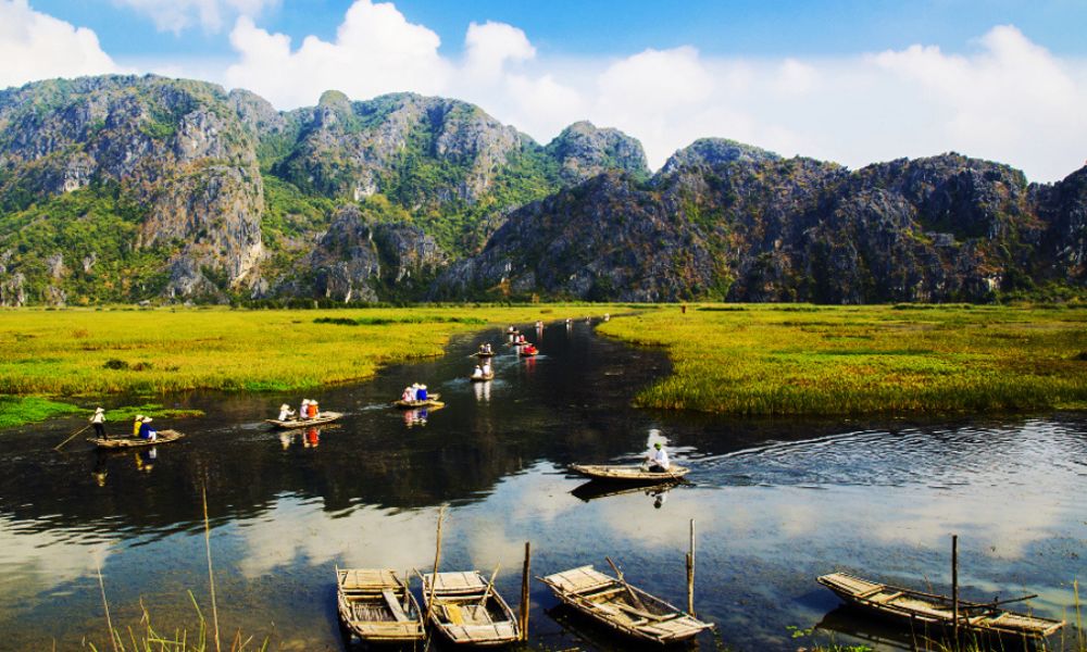 Less famous but no less breathtaking than Trang An or Tam Coc, Van Long offers a more tranquil and authentic experience - ideal for travelers who love nature, photography, and quiet boat rides through untouched scenery.